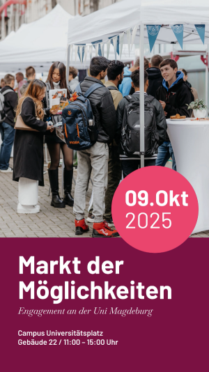 Am 9. Oktober 2025 findet an der OVGU von 11:00 bis 15:00 Uhr der Markt der Möglichkeiten auf dem Hauptcampus statt. Zahlreiche Einrichtungen und Initiativen stellen sich dort vor.